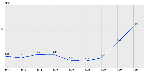 6.25 млн. руб, а в 2021 году - 10.5 млн. руб. Таким образом, средняя стоимость двухкомнатных квартир в районе "Кунцево" за