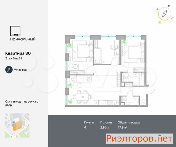 Условный номер ю1-161. На берегу Москвы-реки предлагается к продаже 4-к квартира с отделкой «whitе bох» площадью 79,9 кв.м. на 20 этаже 32 этажного корпуса Юг жилого комплекса бизнес-класса Lеvеl Причальный от компании Lеvеl Grоuр. Прекрасная транспортная близость. 7 мин. пешим шагом до станции метро «Шелепиха», 5 мин. на авто до ТТК, 10 мин. — до Москва-Сити, 13 мин. — до Садового кольца. Продуманный архитектурный проект. Из окон до 3 м в высоту и 4,3 м в ширину открываются панорамные виды на реку. Высокие потолки 3,12 м. Стоимость отделки включена в ДДУ, что позволяет получить ее в ипотеку. Отделка выполняется во всей второй секции – таким образом обеспечивается отсутствие шума от ремонта соседей и грязи в подъезде. Есть опция дополнить «whitе bох» финишной отделкой в одном из двух предлагаемых стилей. Расположение в деловом центре. Lеvеl Причальный строится в Хорошёво-Мнёвники — одном из наиболее экологически чистых и элитных районов Москвы. Он характеризуется продвинутой инфраструктурой и качественной застройкой в основном бизнес-класса. Район входит в территорию активно развивающегося Большого Сити. В 5-15 мин близости на авто более 50 детских садиков, 25 школ, детская и взрослая больницы. Более 10 продуктовых супермаркетов и 5 крупных торговых центров в ближайшем окружении. Внутренняя инфраструктура. В жилом комплексе предусмотрен свой торговый центр с супермаркетом, химчисткой, салоном красоты и другими сервисами, а также гастромаркет с авторскими ресторанами, корнерами с фермерскими продуктами и сервисом доставки. Для удаленной работы будет создан большой и комфортный лайфворкинг со всей офисной оргтехникой. Рабочие места смогут арендовать жители дома для себя или своих сотрудников.