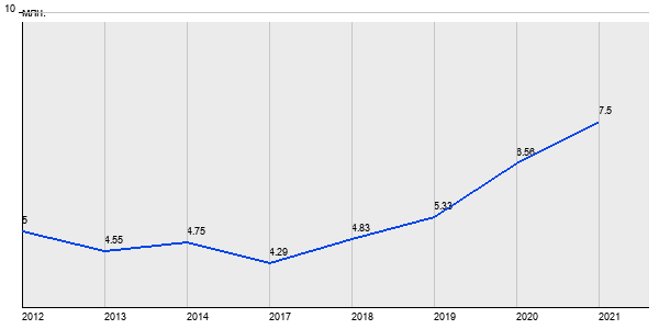 5 млн. руб, а в 2021 году - 7.5 млн. руб. Таким образом, средняя стоимость однокомнатных квартир в районе "Зябликово" за
