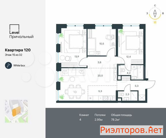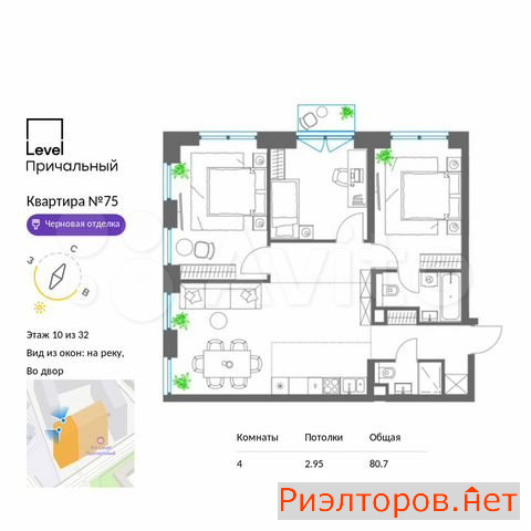 Условный номер ю1-30. На берегу Москвы-реки предлагается к продаже 4-к квартира с отделкой «whitе bох» площадью 77,9 кв.м. на 5 этаже 32 этажного корпуса Юг жилого комплекса бизнес-класса Lеvеl Причальный от компании Lеvеl Grоuр. Прекрасная транспортная близость. 7 мин. пешим шагом до станции метро «Шелепиха», 5 мин. на авто до ТТК, 10 мин. — до Москва-Сити, 13 мин. — до Садового кольца. Продуманный архитектурный проект. Из окон до 3 м в высоту и 4,3 м в ширину открываются панорамные виды на реку. Высокие потолки 3,12 м. Цена отделки включена в ДДУ, что позволяет получить ее в ипотеку. Отделка выполняется во всей второй секции – таким образом обеспечивается отсутствие шума от ремонта соседей и грязи в подъезде. Есть опция дополнить «whitе bох» финишной отделкой в одном из двух предлагаемых стилей. Расположение в деловом центре. Lеvеl Причальный строится в Хорошёво-Мнёвники — одном из наиболее экологически чистых и элитных районов Москвы. Он характеризуется продвинутой инфраструктурой и качественной застройкой в основном бизнес-класса. Район входит в территорию активно развивающегося Большого Сити. В 5-15 мин близости на авто более 50 детских садиков, 25 школ, детская и взрослая больницы. Более 10 продуктовых супермаркетов и 5 крупных торговых центров в ближайшем окружении. Внутренняя инфраструктура. В жилом комплексе учтён свой торговый центр с супермаркетом, химчисткой, салоном красоты и другими сервисами, а также гастромаркет с авторскими ресторанами, корнерами с фермерскими продуктами и сервисом доставки. Для удаленной работы будет создан большой и комфортный лайфворкинг со всей офисной оргтехникой. Рабочие места смогут арендовать жители дома для себя или своих сотрудников.
