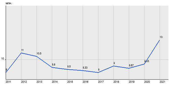 8 млн. руб, а в 2021 году - 13 млн. руб. Таким образом, средняя стоимость трёхкомнатных квартир в районе "Южное Бутово" за