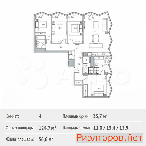 Предлагается к продаже четырёхкомнатная квартира площадью 124,7 кв.м на 5 этаже 13 этажного дома в Жилой квартал "Береговой - 2" от компании Главстрой. Дом в форме волны на берегу реки с самыми современными общественными пространствами. Здесь - открытые крыши, на которых есть возможность устраивать бранчи и кинопоказы, и два двора с замысловатым зонированием, где нашлось место и детским площадкам, и общественной оранжерее, и площади для собрания жильцов, и пространству для воскресных ярмарок. Панорамные окна Берегового выходят на реку и Сити, а планировки сделаны так, чтобы подойти семьям с самым разным составом и увлечениями. На нашем сайте мы описываем, как и почему продумывали расположение и количество спален и мест для хранения. Философия квартала - жизнь, свободная от рутины. Пока вы завтракаете в ресторане на первом этаже с видом на пешеходную набережную и реку, проводите рабочую встречу в коворкинге в лобби или идете в фитнес с бассейном на территории квартала, повседневными заботами занимается портье, который всегда доступен за стойкой в лобби или в специальном приложении. Про детский сад и школу на территории и парковку мы даже не говорим - это само собой разумеется. Но стоит упомянуть о причале для речных трамвайчиков, который появится не далеко с Береговым и на котором есть возможность будет сесть на катер и доплыть до метро утром по пути на работу.
