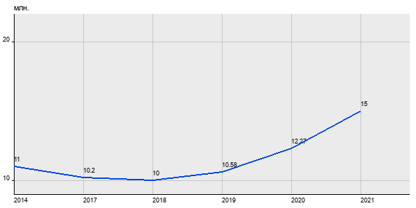 11 млн. руб, а в 2021 году - 15 млн. руб. Таким образом, средняя стоимость трёхкомнатных квартир в районе "Марьино" за