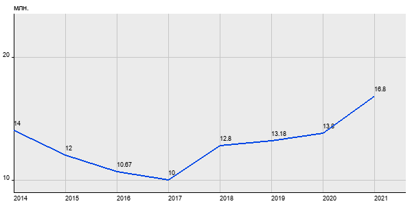 14 млн. руб, а в 2021 году - 16.8 млн. руб. Таким образом, средняя стоимость трёхкомнатных квартир в районе "Ново-Переделкино" за