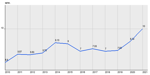 5.5 млн. руб, а в 2021 году - 10 млн. руб. Таким образом, средняя стоимость двухкомнатных квартир в районе "Южное Тушино" за