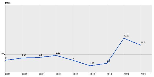 9 млн. руб, а в 2021 году - 11.5 млн. руб. Таким образом, средняя стоимость трёхкомнатных квартир в районе "Бирюлёво Восточное" за