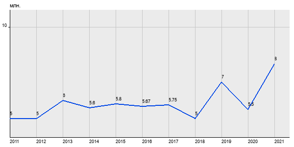 5 млн. руб, а в 2021 году - 8 млн. руб. Таким образом, средняя стоимость однокомнатных квартир в районе "Зябликово" за