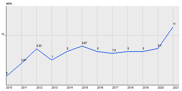 5 млн. руб, а в 2021 году - 11 млн. руб. Таким образом, средняя стоимость двухкомнатных квартир в районе "Коньково" за