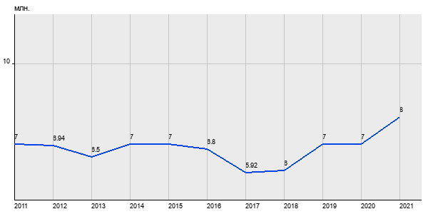 7 млн. руб, а в 2021 году - 8 млн. руб. Таким образом, средняя стоимость двухкомнатных квартир в районе "Орехово-Борисово Северное" за