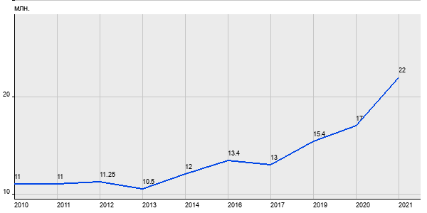 11 млн. руб, а в 2021 году - 22 млн. руб. Таким образом, средняя стоимость двухкомнатных квартир в районе "Хамовники" за