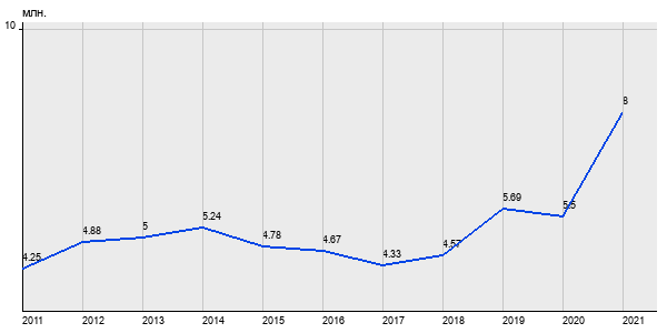4.25 млн. руб, а в 2021 году - 8 млн. руб. Таким образом, средняя стоимость однокомнатных квартир в районе "Бирюлёво Восточное" за