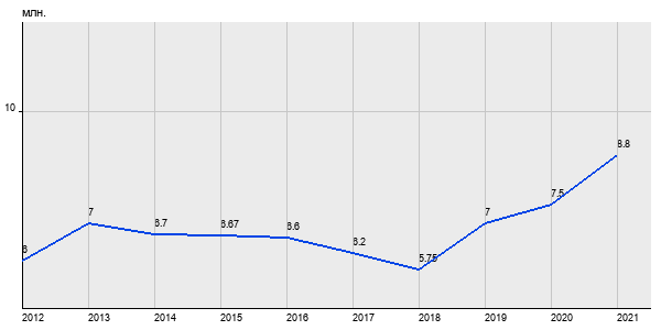 6 млн. руб, а в 2021 году - 8.8 млн. руб. Таким образом, средняя стоимость двухкомнатных квартир в районе "Орехово-Борисово Северное" за