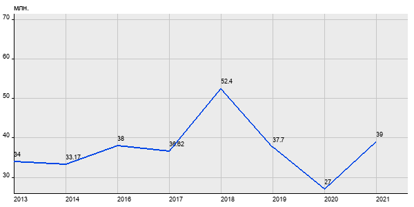 34 млн. руб, а в 2021 году - 39 млн. руб. Таким образом, средняя стоимость трёхкомнатных квартир в районе "Якиманка" за
