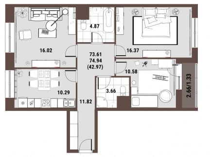 Квартира 3-к. 75.3 м2