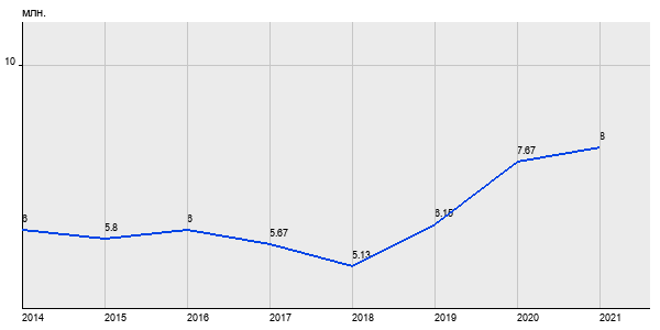 6 млн. руб, а в 2021 году - 8 млн. руб. Таким образом, средняя стоимость однокомнатных квартир в районе "Солнцево" за