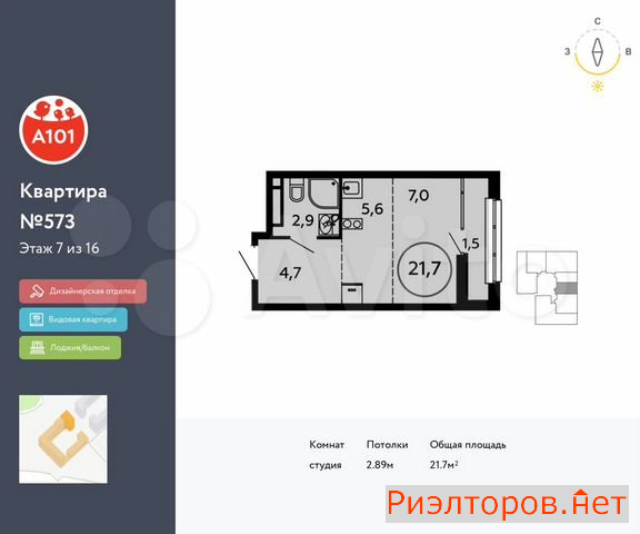 Общая площадь 21.7 м