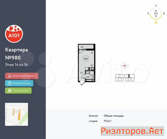 Общая площадь 19.2 м