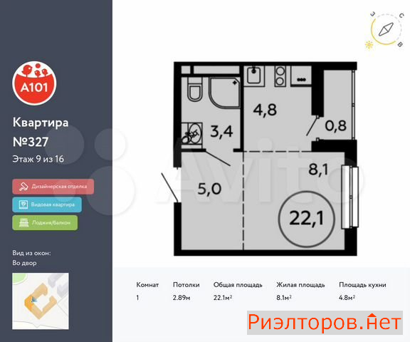 Общая площадь 22.1 м