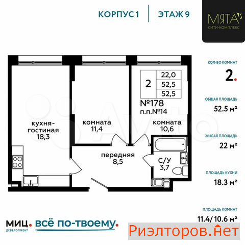 Общая площадь 52.5 м