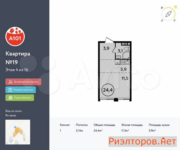 Общая площадь 24.4 м