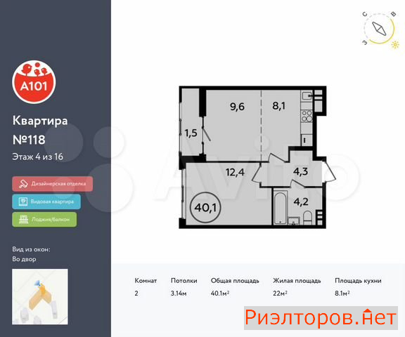 Общая площадь 39.0 м