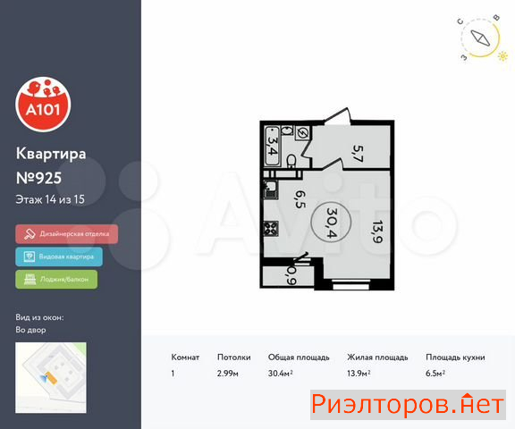 Общая площадь 30.4 м