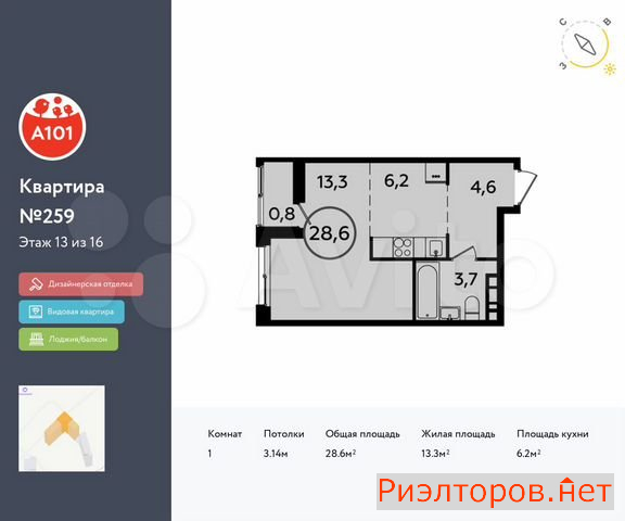 Общая площадь 28.6 м