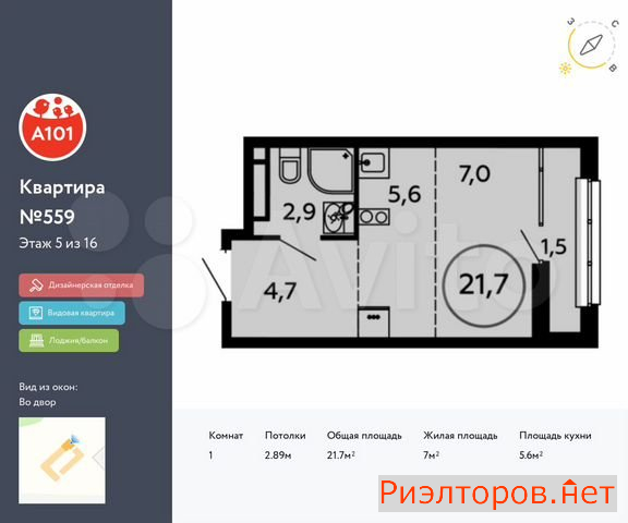 Общая площадь 21.7 м