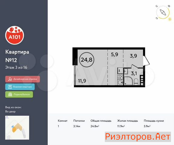 Общая площадь 24.8 м