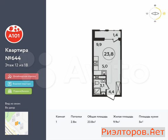 Общая площадь 23.8 м