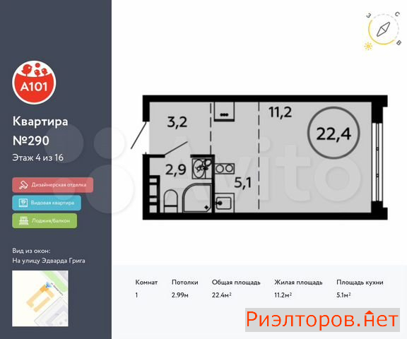 Общая площадь 22.4 м