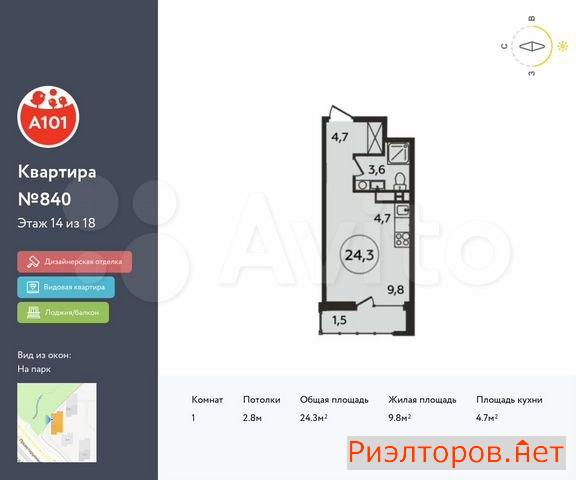 Общая площадь 24.3 м