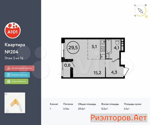 Общая площадь 29.5 м