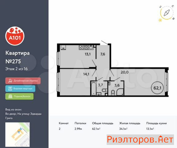 Общая площадь 62.0 м
