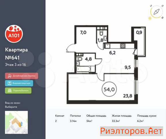 Общая площадь 54.0 м