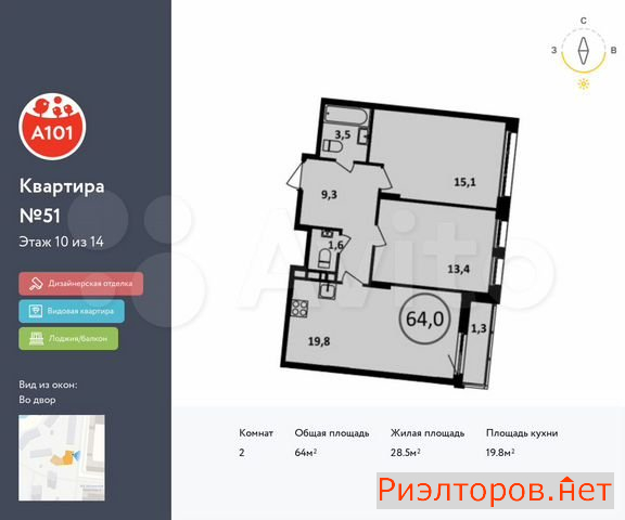 Общая площадь 64.0 м