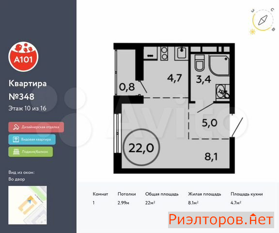 Общая площадь 22.0 м