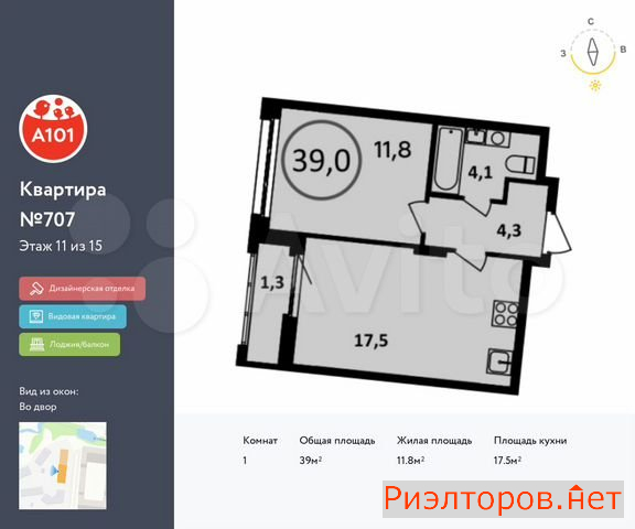 Общая площадь 39.0 м