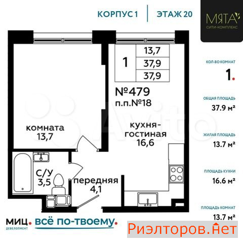 Общая площадь 37.9 м
