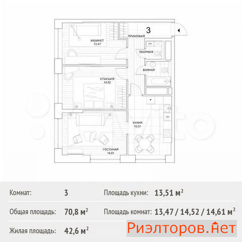 Общая площадь 61.0 м