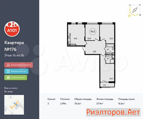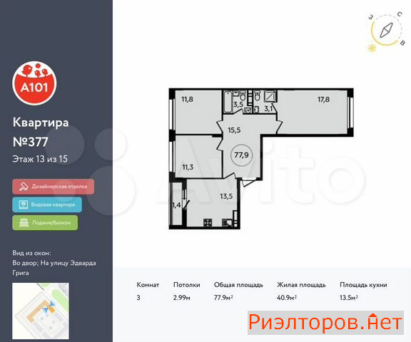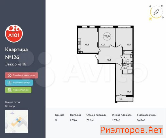 Общая площадь 77.0 м