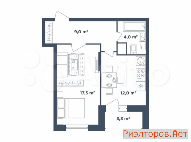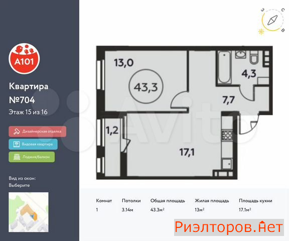 Общая площадь 43.0 м