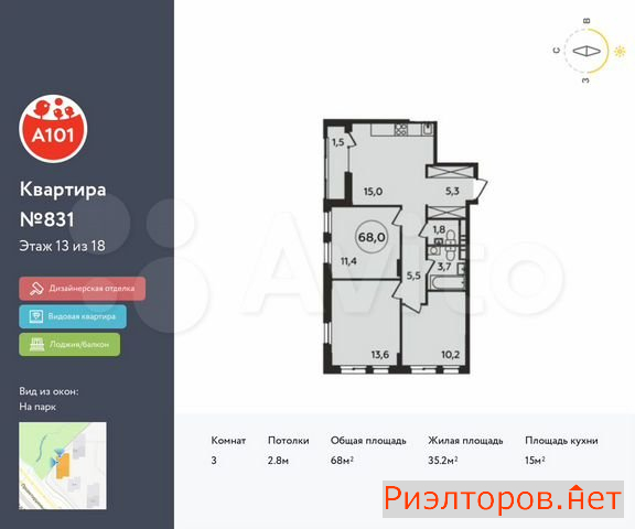 Общая площадь 68.0 м