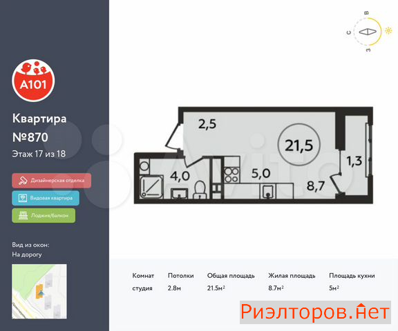 Общая площадь 21.5 м