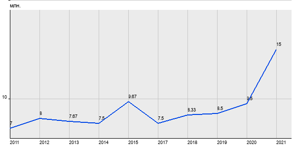 7 млн. руб, а в 2021 году - 15 млн. руб. Таким образом, средняя стоимость трёхкомнатных квартир в районе "Коптево" за